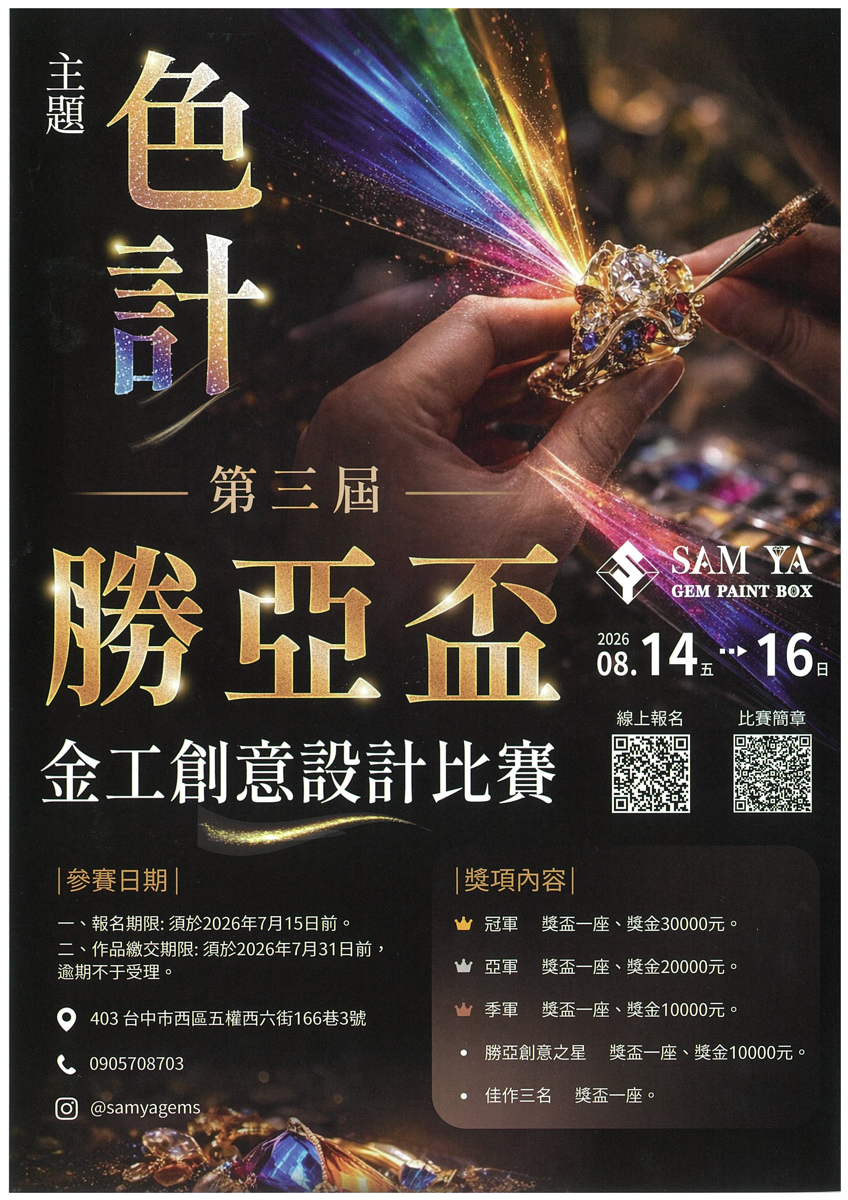 與第三屆勝亞金工創意設計比賽,將於2026年8/14至8/16,在勝亞寶石台中門市進行為期三天的評比及展